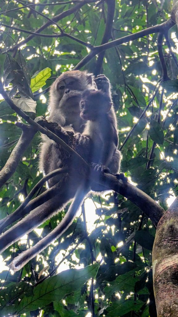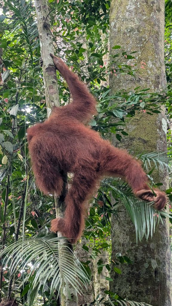 I am so glad we decided to come here. I really do love nature, but I don’t like to see animals in captivity. So adventures like this are amazing to see them in their natural habitat. And to hear of the great successes…. Indonesia is not a great place for animals all in all, and there have sadly been a lot of extinctions caused by humans in the last 50 years. Mostly due to habitat destruction for palm oil and rubber plantations, poaching, the animal pet trade and a lot for Chinese medicine, especially true for the poor Sumatran rhino. ☹️😢 But the orangutans in Bukit Lawang are a rare success story, as this outpost was set up in 1973 as a rehabilitation centre for mostly orphaned and pet orangutans. The charity attempted to re-wild many captive ex-pets, and also ran a breeding program. The orangutans were supported by the creation of protected areas, and the use of feeding stations, which were gradually phased out. And tourism massively helped their cause too, by giving locals a real incentive for conservation and alternative means of income compared to logging. By 1991, the numbers in the region had doubled and the programme ended as it was deemed a success! 😃 Today there is no feeding of the orangutans, and they are left to fend for themselves, and their population is still growing. But since they live a long time (in some cases up to 60 years old!) and have good memories, some in this region are still classed as “semi-wild” as they are not scared of people and were once pets and fed by the rangers.