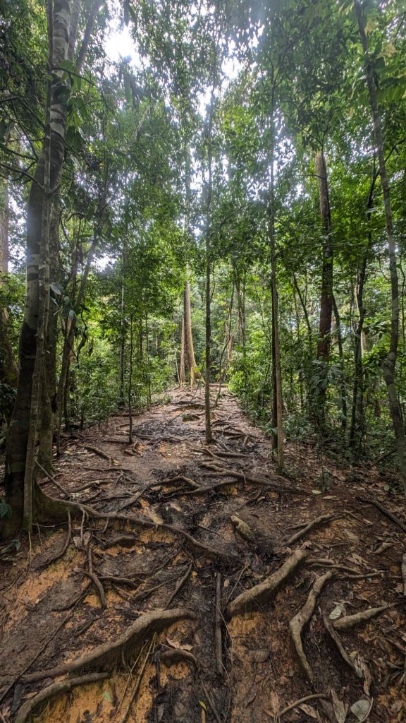 Our guide said we should stay patient, as after the orangutan has slept off their food from the morning, they’ll be up again looking for more food just after lunch. So we ate nearby and when we’d finished we headed back to see if she was up yet, and she was, but she was on the move, and fast! Us and one other couple on a separate private trek followed her down the hill side, which was incredibly slippery from the previous days rain. We slipped and slid towards her, eventually finding flat ground and were rewarded with basically a private display. She was curious of us and tried to get close, swinging in the trees above our heads, but then she got a bit bored of us and just started eating in the tree tops, some termites, some young rattan leaves and some fruits. It was incredible to see her so close, we had to keep moving to move away from here, as you’re not supposed to get that close, but as we moved away, she kept moving closer haha.