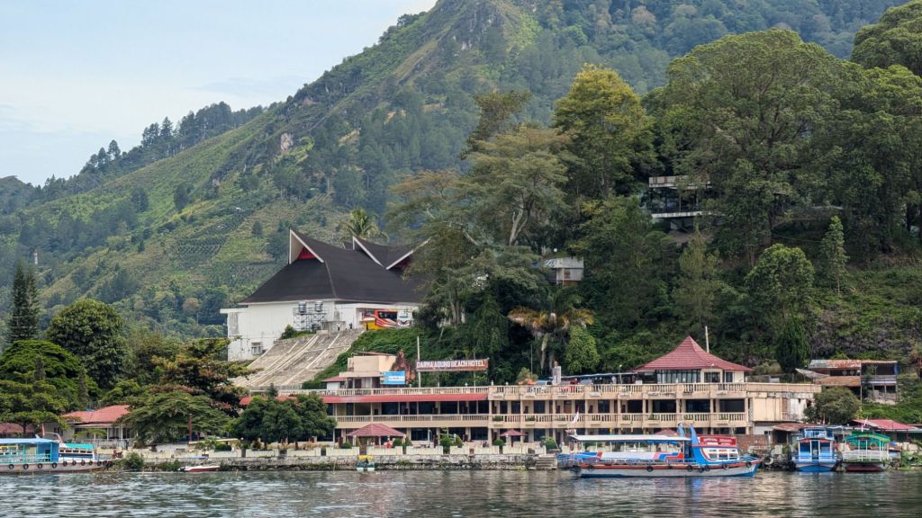We got a “tourist bus” again from Berastagi which dropped us at Parapat on the lake edge, a large fishing port and gateway to Samosir island.