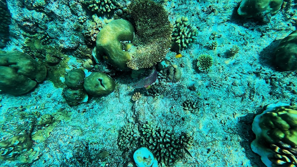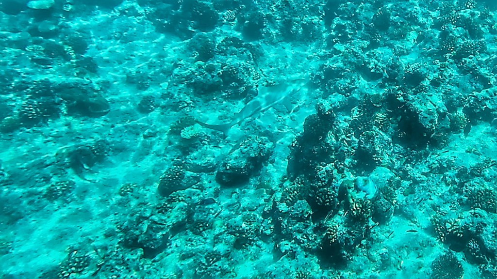 We then spotted a pretty big black tip reef sharks easily 6ft, the biggest one we’ve seen so far, it glided past us gracefully. I don’t think anyone else spotted it. I tried to follow with the GoPro, but it easily outpaced me as we were swimming against the current. It didn’t seem phased by us either way…