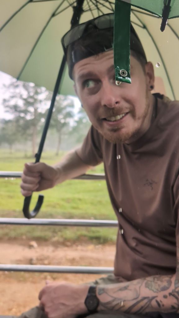 We ran back to the jeep (which was open top, might I add… Basically just the back of a pick up truck with benches in…), but it was already too late, we were too deep inside the park! Fortunately, the jeep did have umbrellas, and just in time, as the rain was POURING! It filled the back of the jeep!!