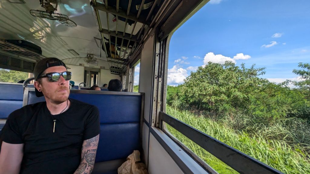 Trains in Thailand are lovely, they are on time, always very cheap (for ordinary, as opposed to the express ones), comfortable and clean. But they often have no AC, just an open window and fans. Which is fine a lot of the time, unless there’s a heatwave or a storm… And yes, there’s a heatwave here, so it was very hot haha. And weirdly, we got absolutely caked in a layer of orange dust, staining all our clothes and our backpacks… We think from the soil or the mines which run parallel to the train tracks here.