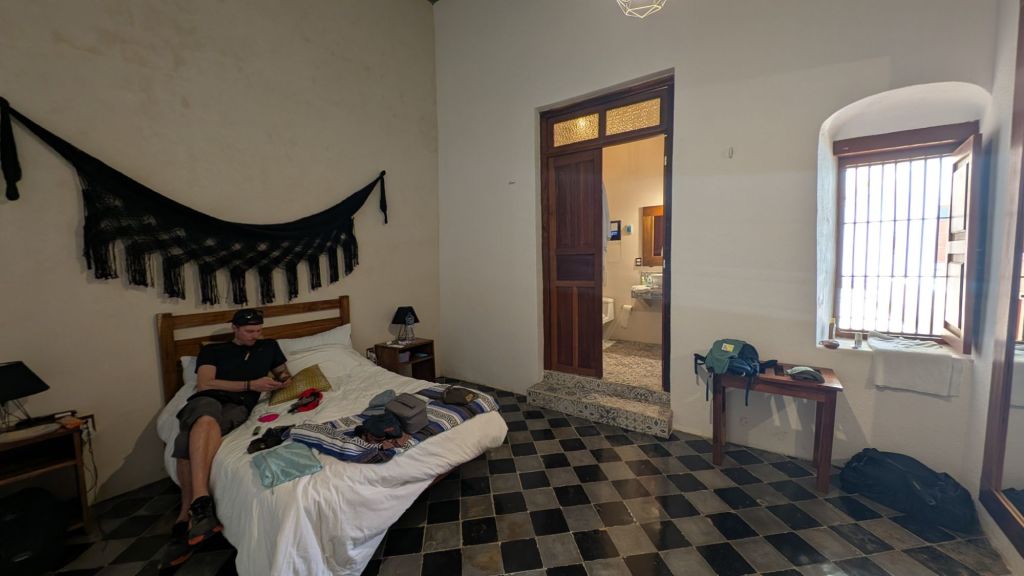 The bus dropped us outside of the centre and so we got a taxi towards our hotel. The place we’d booked in Campeche was a bit of a “splurge” (ish). It was a bit of a nicer boutique hotel with rooftop pool, but I’d managed to get it super discounted on Hotels.com, plus used a cashback site, so it was still only £34 a night! Plus it meant we could stay inside the walls of the old town, where all the cool stuff is in Campeche.
