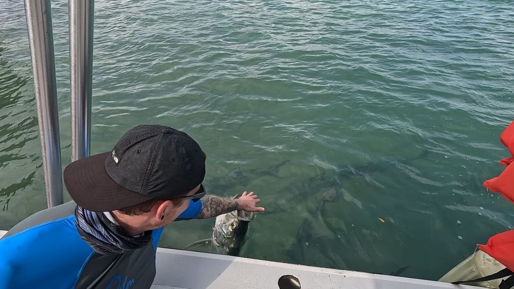 Tarpon Point is an area still within Caye Caulker which has huge Tarpon fish, and other boats feed them, but in our boat they said just put your hand out over the water and the fish will jump up to you. They were HUGE fish, but they don’t have any teeth, so it’s not dangerous. Dave stuck his hand out and said it was like getting punched! Haha