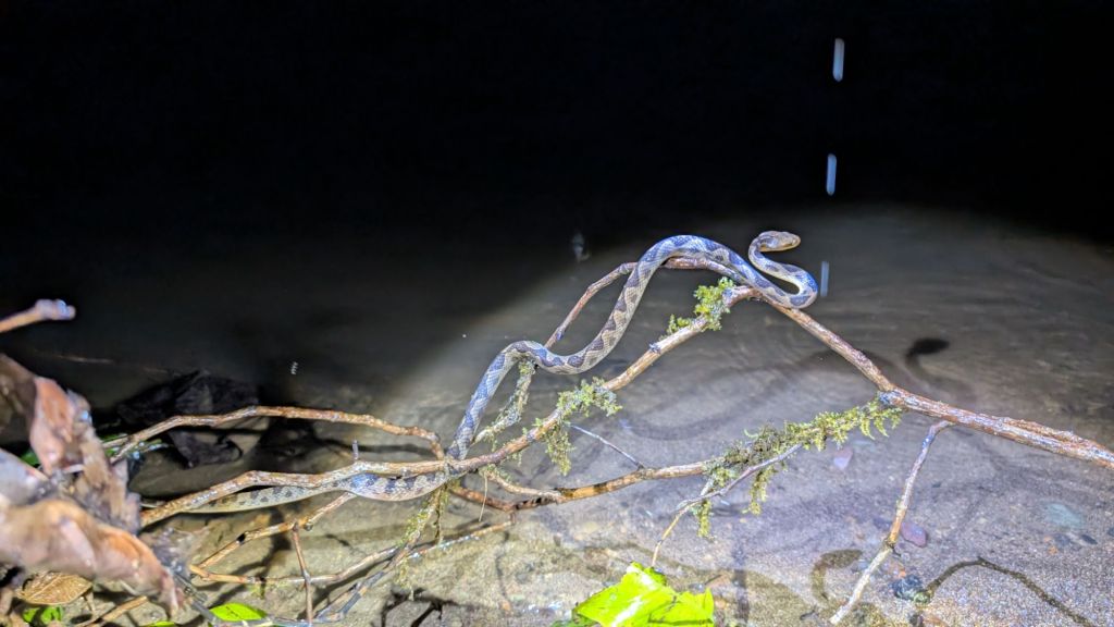 We saw a lot of frogs, mostly poisonous ones and loads of stick insects and spiders, including the water spiders which walk on water. We also saw a few birds, fast asleep, including a kingfisher and a little Manakin, all puffed up and hiding from the rain. We also saw a small snake which mimics the venomous fer de lance, but is safe, and right at the end we saw a highly venomous black tarantula…
