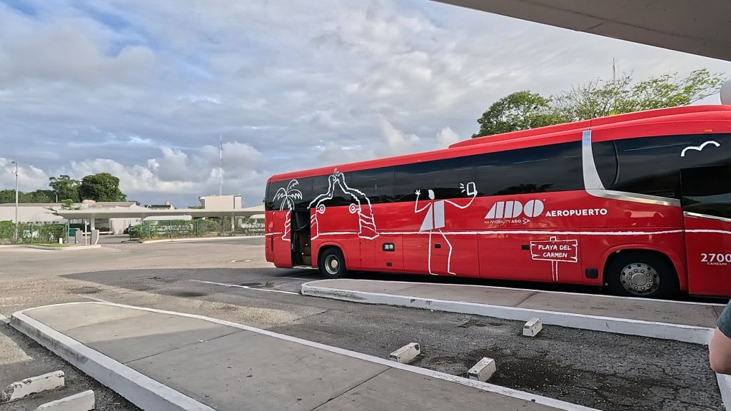 We landed at 3pm, and eased through immigration, getting a permit to allow us to stay in Mexico until August haha, not bad! But then we had to wait about 2 hours for my bag to come off the flight! Not cool… And the baggage hall was crowded full of frustrated tourists with the same issue. Apparently there were some customs inspections which were delaying all the bags… But, by 5:20pm, we were on the ADO bus heading South to Playa del Carmen, and feeling a lot more relaxed!