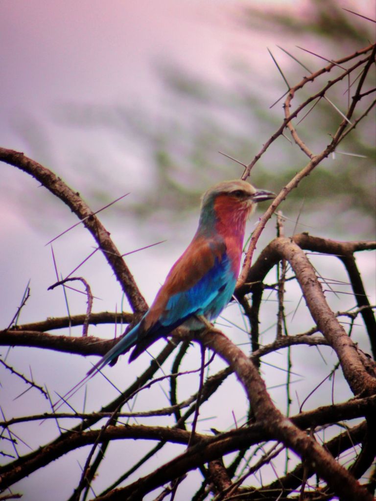 Still, we did see animals thankfully, and despite the weather (on/off raining most of the day) we saw lots of things. Including elephants – which even though are exactly the same species as the big tuskers in Amboseli, looked completely different, their skin more orange brown stained by the mud here, and their tusks much smaller). We also saw lots of birds, our first hornbill, lilac breasted rollers everywhere, baboons, giraffes and lots of very cool baobab trees.