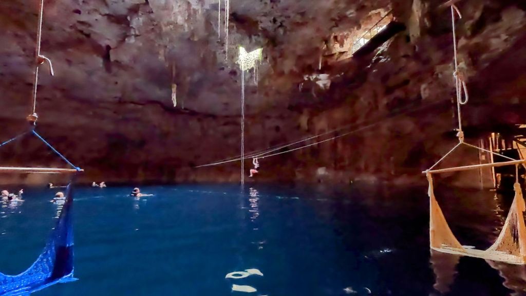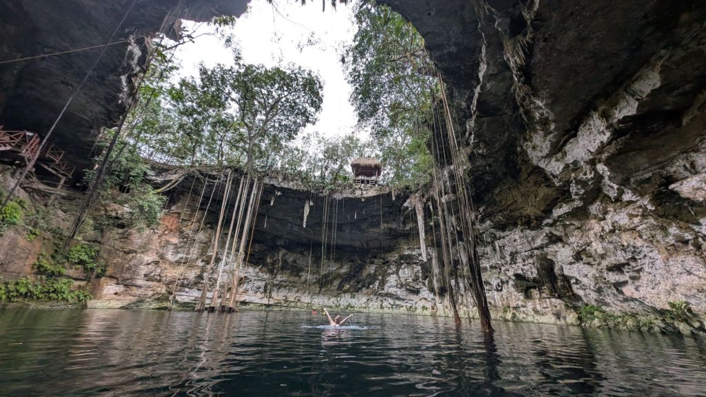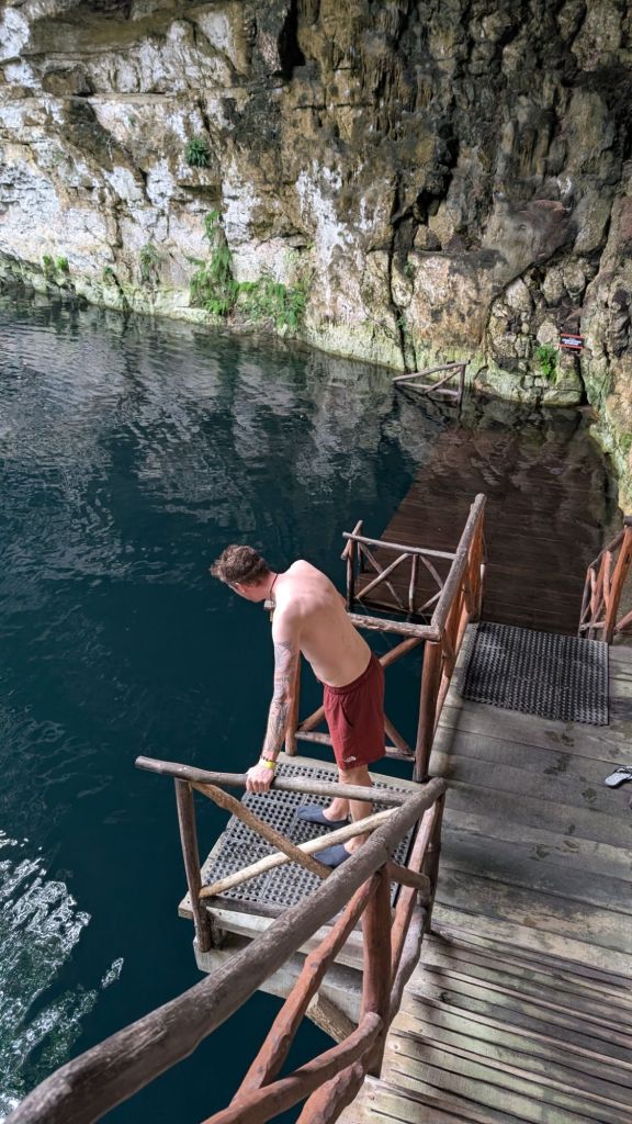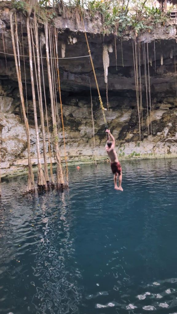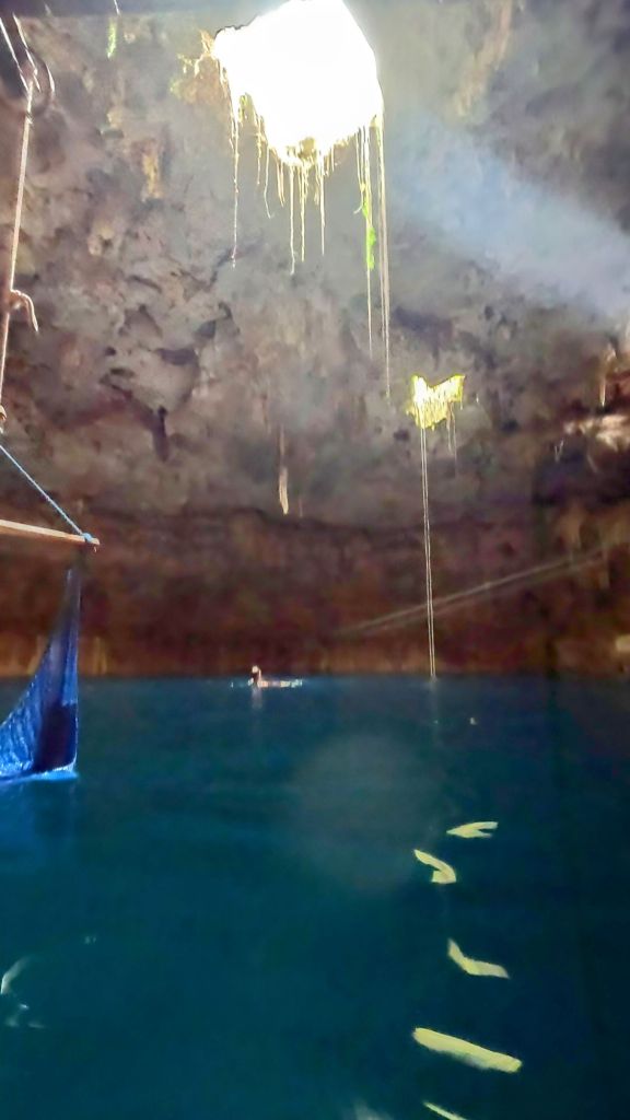 After Ek Balam, the first cenote was Chukum, a closed one, basically a cave with a couple of small openings letting in light which was cool. This cenote was very commercial and had large changing rooms, a restaurant and inside, ziplines and jumps, but given the overcast rainy day, the water was not super appealing and was pretty cold actually!!! I got in and out almost immediately, but Dave did a few ziplines!