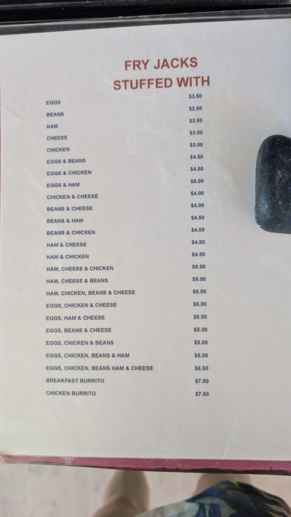- Breakfast/Lunch Hero: Errolyn’s House of Fry Jacks. This is non-negotiable. At BZD 4.50 a pop, this is the cheapest, tastiest fuel on the island. We went vegan/veggie with beans and eggs (for the non-vegans). Get there early; they shut up shop at 1 pm sharp!