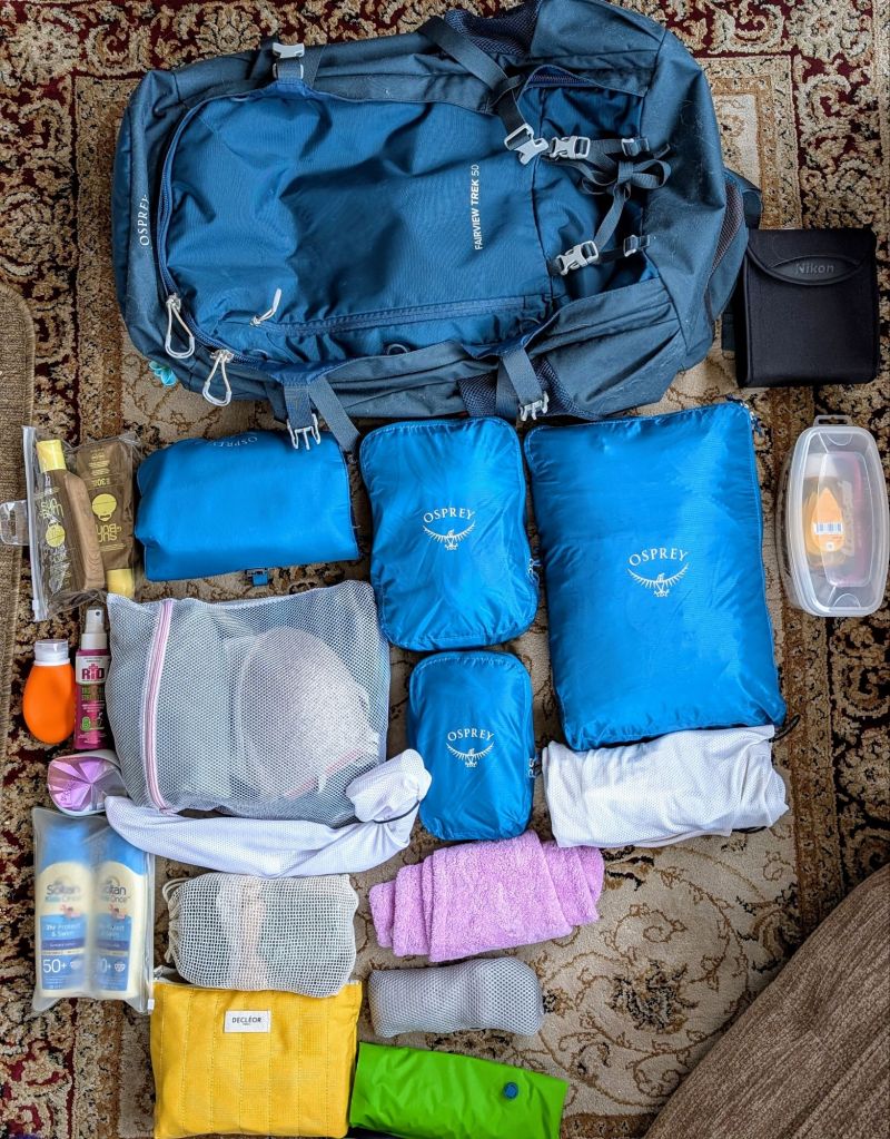 Osprey packs are just the best and this 50L bag is slightly too big in all honesty, and is definitely underfilled, but that means I have room to combine my main bag and day pack into 1 bag once we get there, which will be a bit of a game changer I think, just having one bag. And it’s SO comfy to wear.